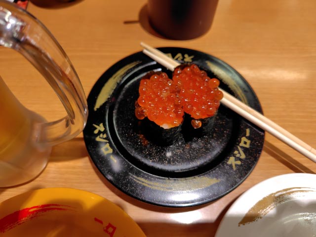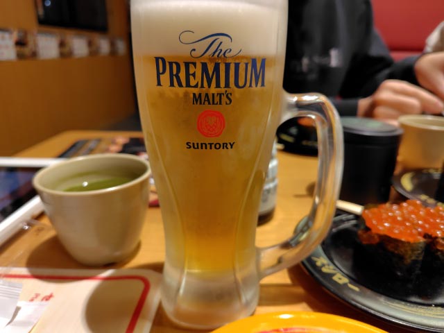 生中、寿司x40皿、寿司大皿、茶碗蒸しx2、麺類、お椀、ドリンク等:\12690/7人